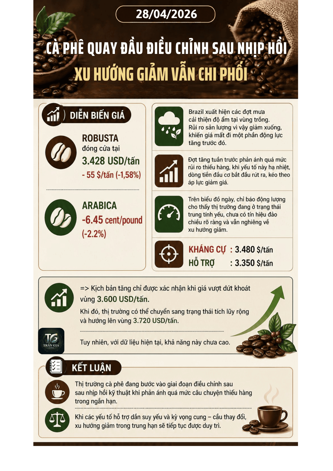 Phiên 27/04 không có nhiều tin tức hay số liệu tác động lên thị trường cà phê, Ở góc độ dòng tiền, đợt tăng mạnh tuần trước theo Trần Gia là do thị trường phản ánh quá mức các yếu tố rủi ro như thiếu hàng, gián đoạn vận chuyển và căng thẳng địa chính trị. Khi những yếu tố này dần hạ nhiệt, dòng tiền đầu cơ bắt đầu rút ra, kéo theo áp lực giảm giá.