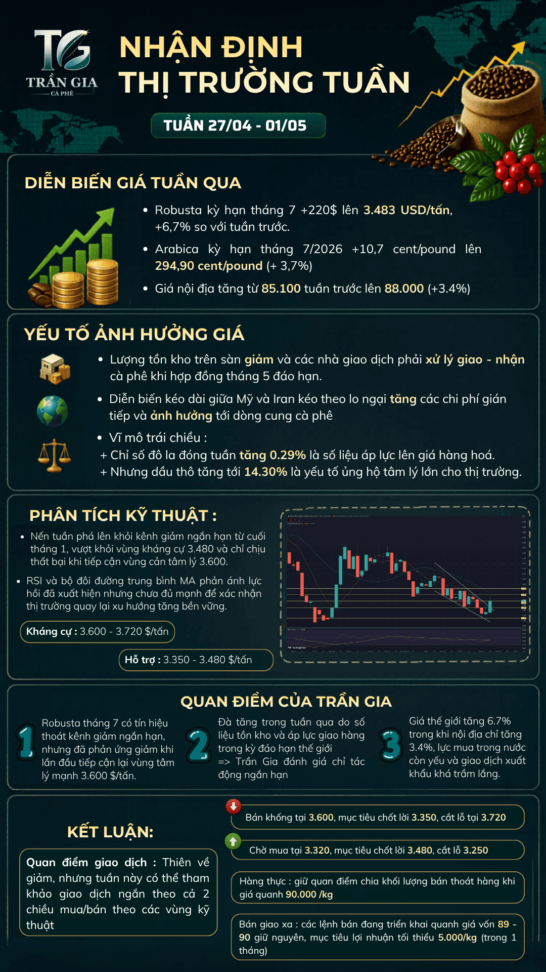 Robusta tháng 7 có tín hiệu thoát kênh giảm ngắn hạn, nhưng đã phản ứng giảm khi lần đầu tiếp cận lại vùng tâm lý mạnh 3.600 $/tấn.