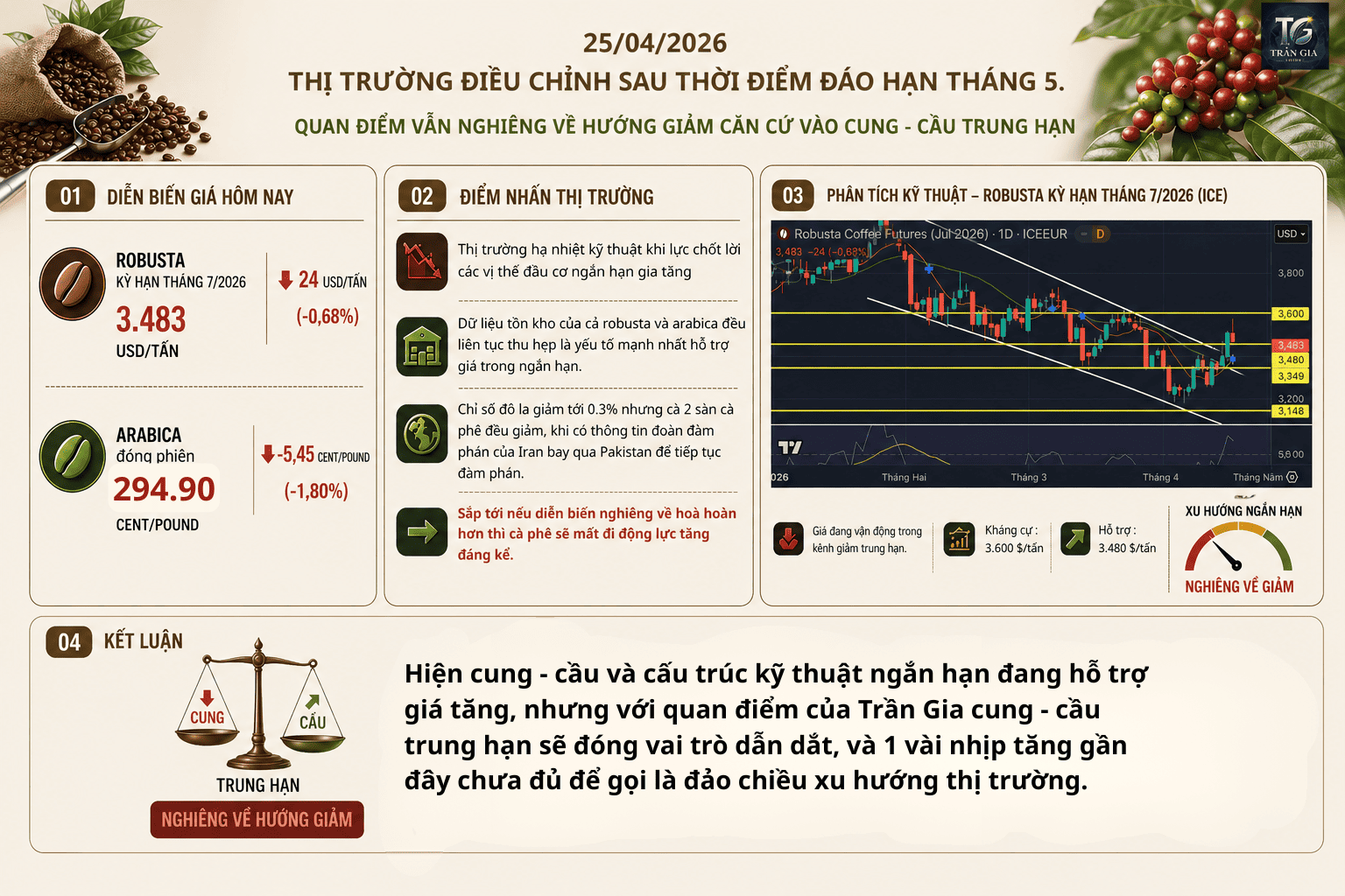 Quan điểm của Trần Gia là cung - cầu trung hạn sẽ đóng vai trò dẫn dắt, 1 vài nhịp tăng gần đây chưa đủ để gọi là đảo chiều xu hướng thị trường, và sớm thôi cà phê sẽ quay về xu hướng giảm chính !