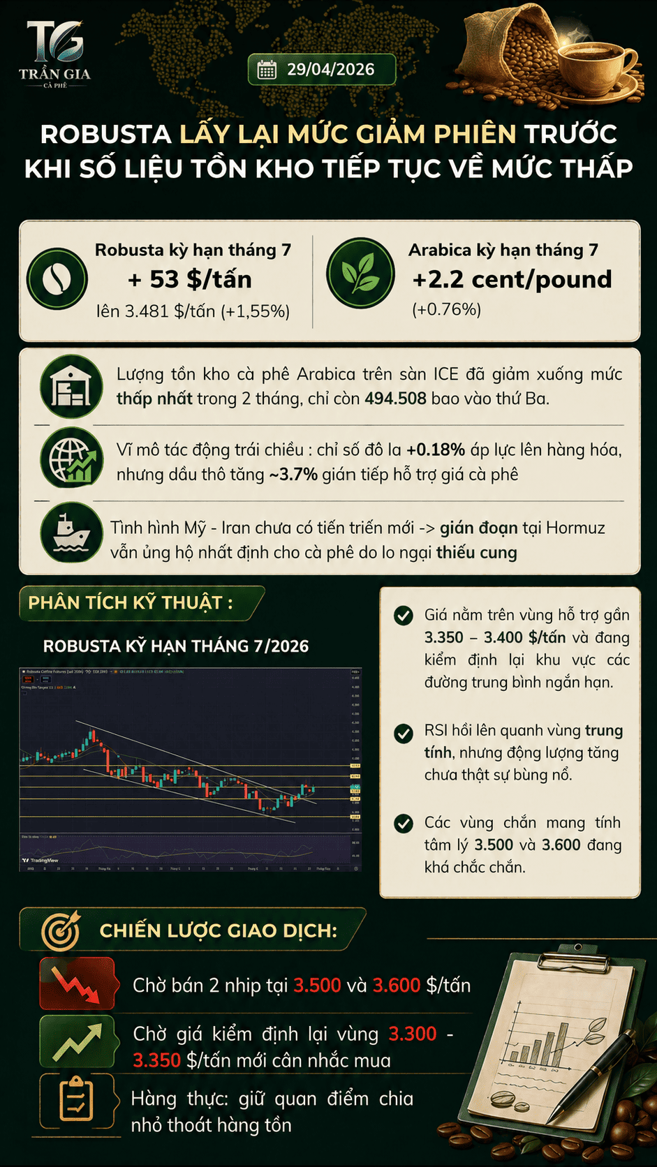 Phiên 28/04 không có nhiều tin tức tác động trực tiếp lên thị trường cà phê. Giá biến động xoay quanh số liệu ngắn hạn khi ICE công bố mức tồn kho mới nhất tiếp tục ở vùng thấp.