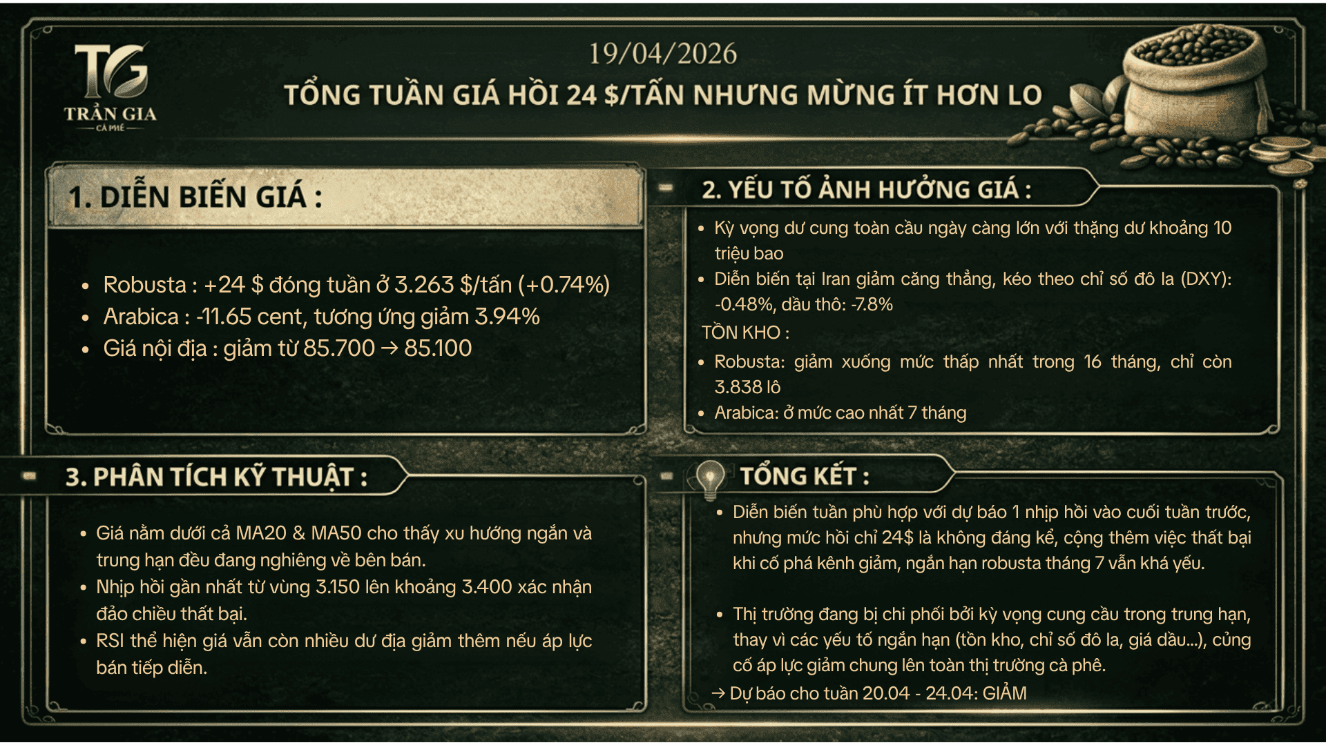 Thị trường đang bị chi phối bởi kỳ vọng cung cầu trong trung hạn, thay vì các yếu tố ngắn hạn. Dù tồn kho robusta tiếp tục giảm xuống mức thấp, lực hỗ trợ không đủ để kéo giá tăng khi thị trường đồng thời phải hấp thụ kỳ vọng dư cung toàn cầu. Tồn kho arabica tăng lên mức cao nhất 7 tháng càng củng cố áp lực giảm chung lên toàn thị trường cà phê